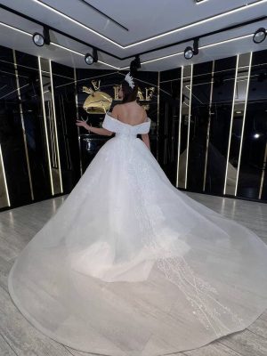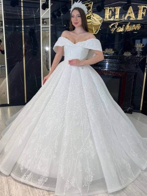 A stunning off-the-shoulder white gown featuring delicate embroidery. Perfectly designed to give you a princess-like look, this gown embodies elegance and charm on any bride’s special day