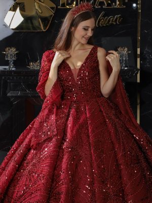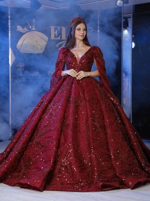 Introducing a luxurious red ball gown by Elaf Fashion. This masterpiece features a deep V-neckline, flowing cape-style sleeves, and intricate sparkling embellishments that add drama and elegance. Ideal for those who wish to make a regal entrance at any special occasion