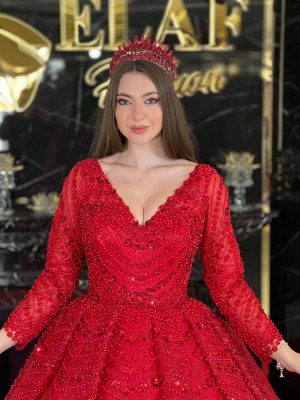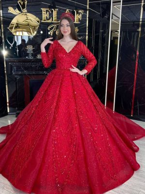 Distinguish yourself with a royal look on your special day with our luxurious wedding dresses. Discover a stunning collection of puffy dresses decorated with shiny embroidery, like this charming red dress that reflects luxury and sophistication. Make your day an unforgettable memory