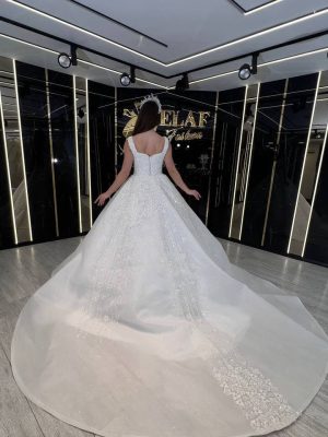 A royal white wedding dress with a luxurious design that makes your dreams come true on the most beautiful days of your life